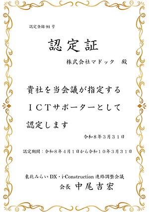 当社は、国土交通省東北地方整備局が創設した「ICTサポーター」に令和8年3月31日付で認定されました。
