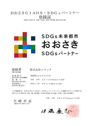 当社は令和8年2月13日に大崎市の「おおさきGIAHS・SDGsパートナー」に登録されました。